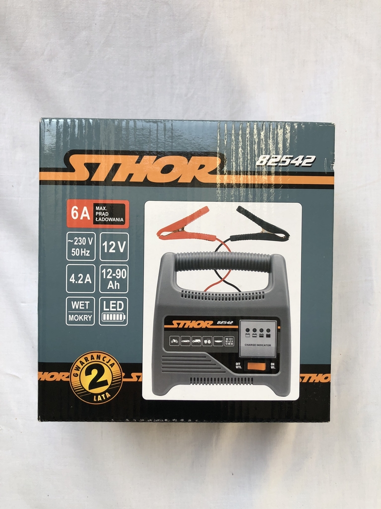 Prostownik marki STHOR posiada transformator toroidalny, zabezpieczenie bezpiecznikiem przed przeładowaniem i przepięciem, włącznik prądowy, ledowy wskaźnik naładowania. Umożliwia dobranie optymalnego prądu ładowania. Urządzenie przeznaczone do ładowanie akumulatorów 12 V w samochodach osobowych, do akumulatorów WET (mokrych, kwasowo-ołowiowych.)